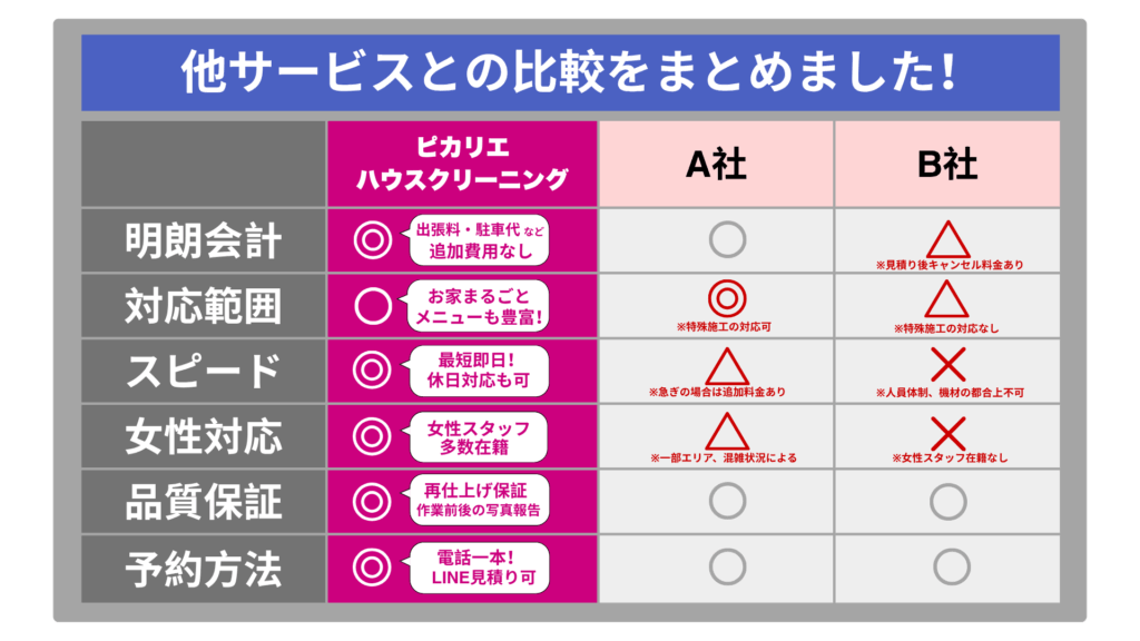 正直なところ、専門分野に特化したハウスクリーニング業者(例:エアコン専門・水回り専門など)と比べて、一部の特殊清掃サービスでは取り扱い内容が限られる場合があるのも事実です。しかしその分、当社ではサービス全般でお客様の高い満足度を追求し、幅広いメニュー・明朗会計・即日対応など安心のサービス体制を整えております。どなたにも納得いただける清潔・快適な暮らしを、オールインワンでご提供します。